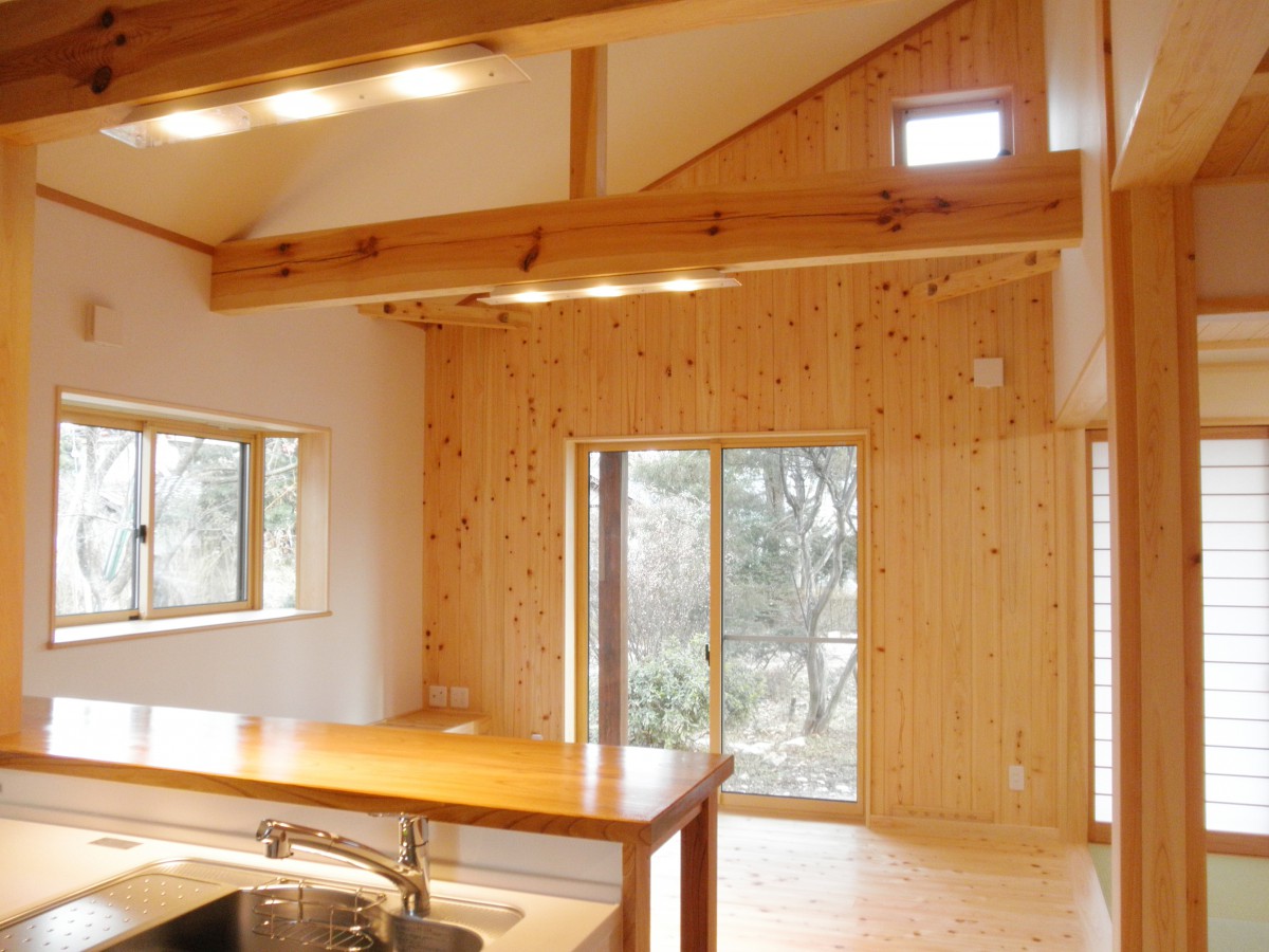 ↓対面式キッチンカウンター:食器棚も一緒に備え付けました。後方の引き戸と食器棚の扉など、桧板で統一感があります。
