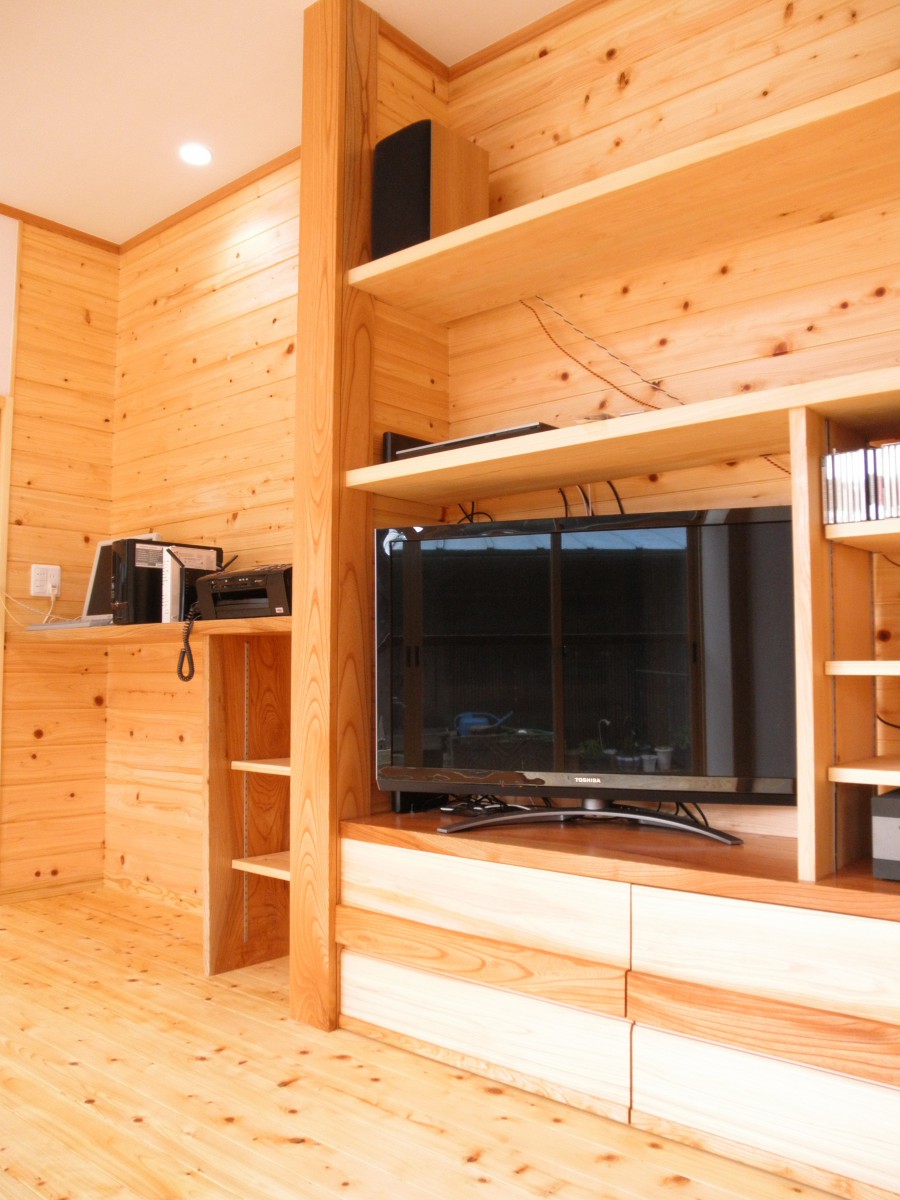↑テレビの下の物入れ2つ、職人さんの手作りの引き出しです。これは家具の範疇ですね。引き出しとなると、ぴったり合わせるというのはかなり大変なのです。桧と欅を使って、色合い的にも素敵になりました。