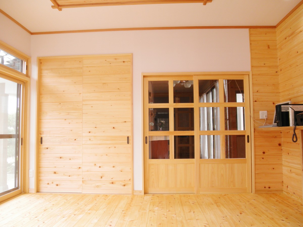 ↑リフォームです。杉の赤みが美しい木製建具。天井の板と揃えてみました。