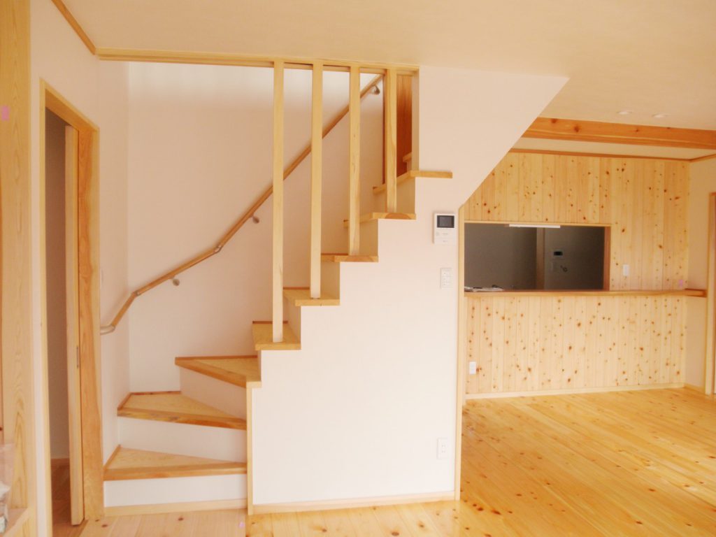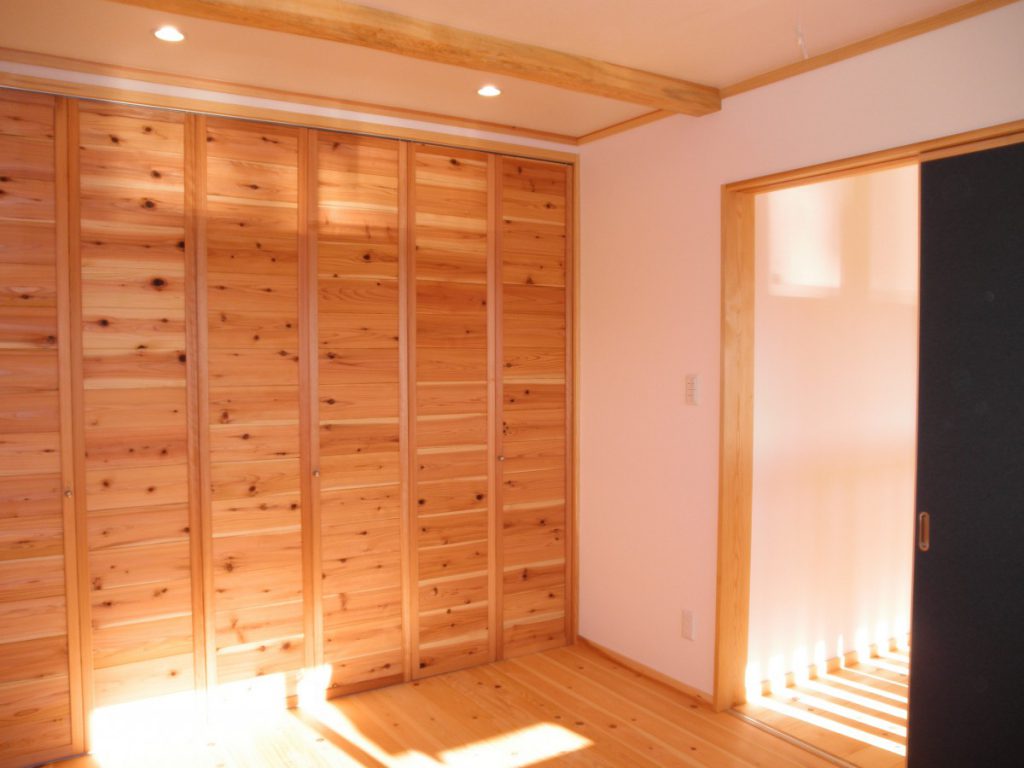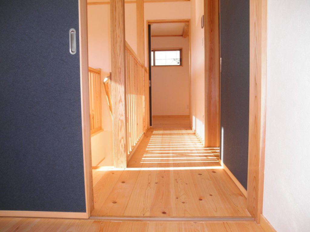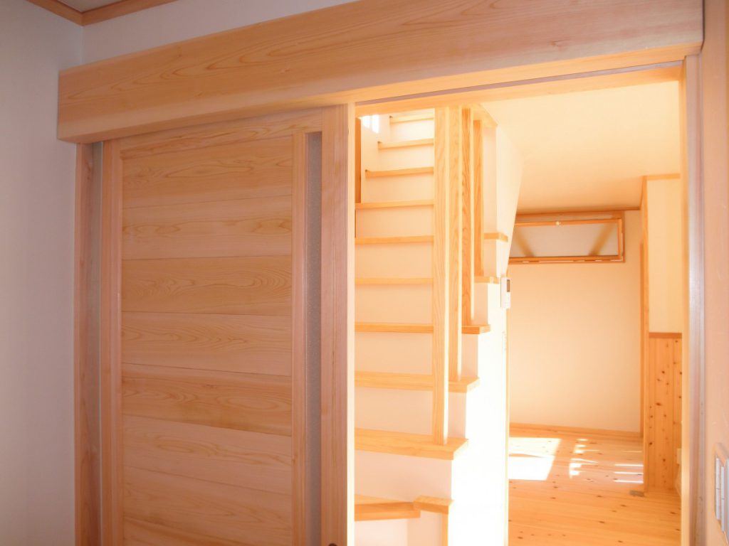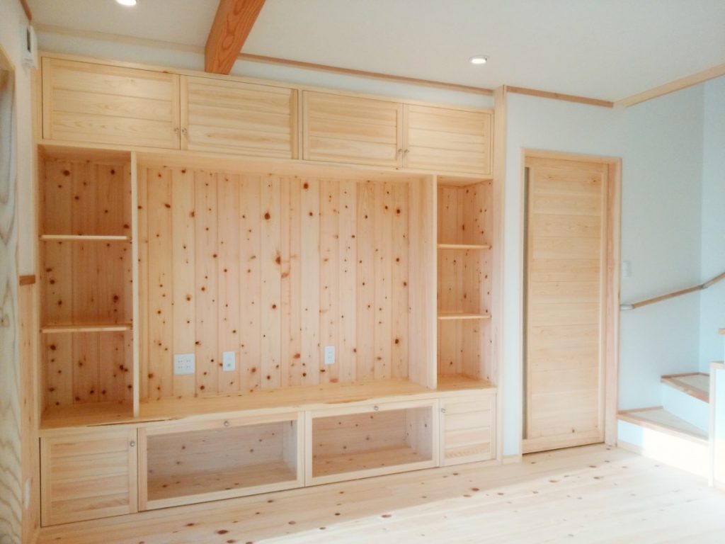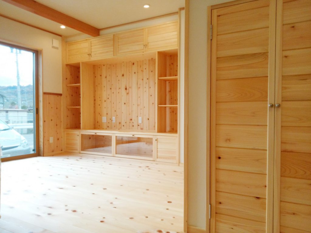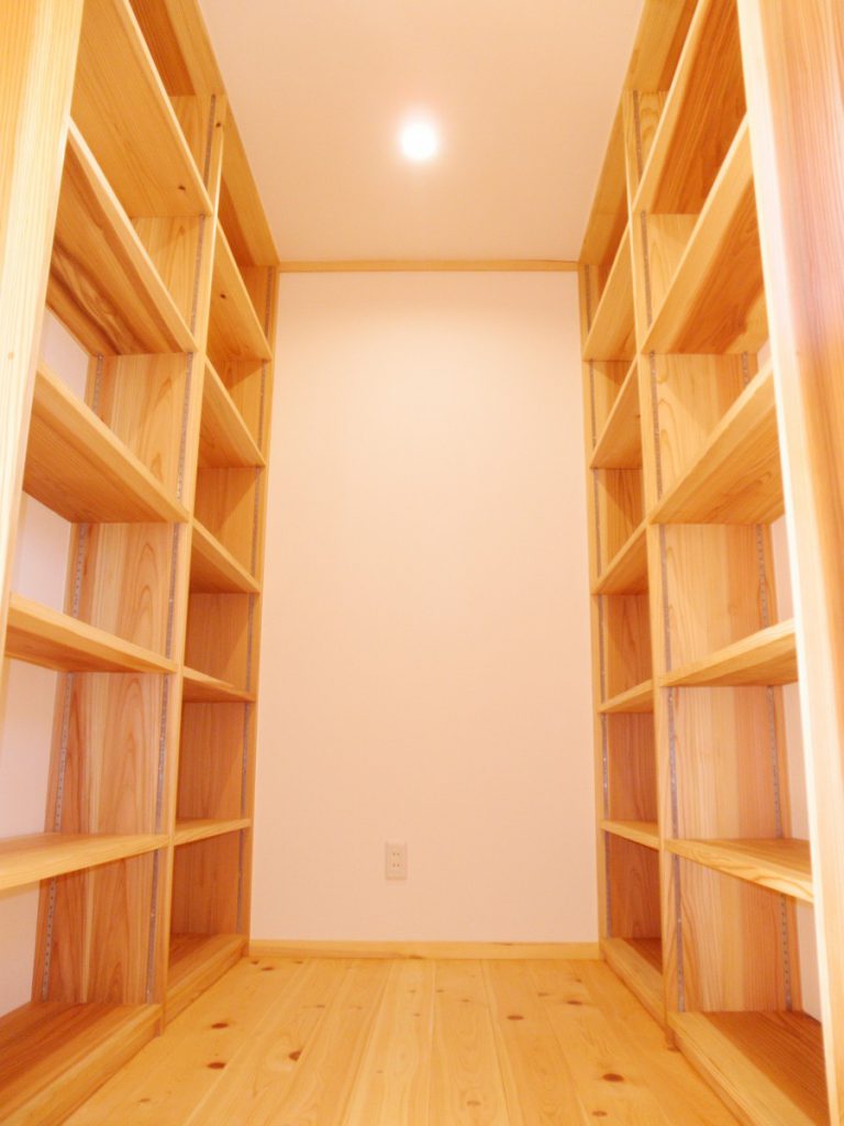 動線を考えた、使い勝手の良い家となりました。決して建築面積は広くはありませんが、魅力が詰まった一棟です。床には主に桧材を使用し、素足で歩くと心地よさが感じられます。腰壁板・棚・キッチンカウンター・建具等には桧・ケヤキ・杉を使用し、木のあたたかみのある空間となりました。手間はかかりますが、手作りの収納棚には家具にはない魅力があります。書斎の天井まである本棚を含め、各部屋にある大小の様々な棚は、棟梁の手刻みによるものです。外部には囲いのあるウッドデッキを備えました。家事室から直に出られ、洗濯物等を干す際は便利です。玄関から入る引き戸には、お施主様による自動開閉の装置が備えられています。(引き戸上部の桧板が機具を覆い隠しています。)こちらの住宅は低炭素住宅です。