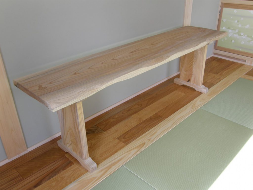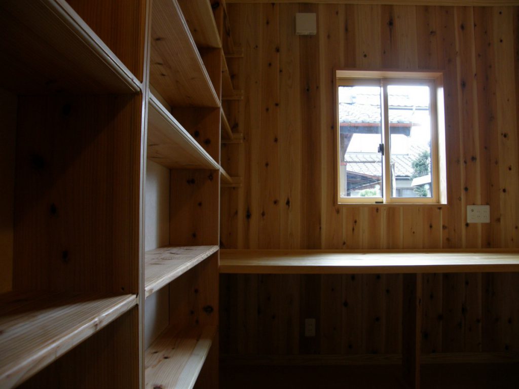 赤松の梁、桧の柱、欅(けやき)のテーブル、栗のカウンター、杉の板壁が映える書斎、階段の踏み板にはつやの出る赤松、天然乾燥による県産材をふんだんに使用しました。(信州ふるさとの住まい助成金を利用)