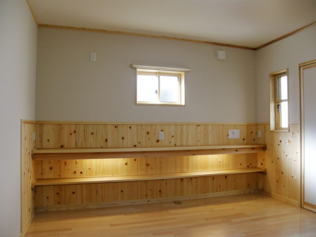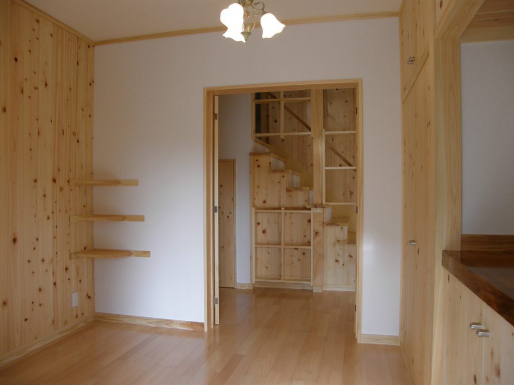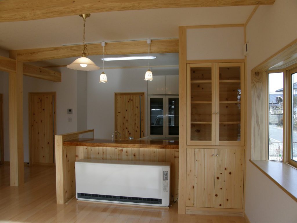~木の樹種の魅力を楽しむ家~ 赤松の梁、桧の柱、欅(けやき)のテーブル、栗のカウンター、杉の板壁が映える書斎、階段の踏み板にはつやの出る赤松、天然乾燥による県産材をふんだんに使用しました。(信州ふるさとの住まい助成金を利用) 陽の光が入りとても明るいリビングです。冬は蓄熱暖房の心地よい暖かさが広い空間をゆっくりやわらかく包んでくれます。和室には松・桧・杉・欅が和の美しさを表現しています。それぞれが存在感を主張しつつも、調和し合っています。 蓄熱暖房・オール電化住宅