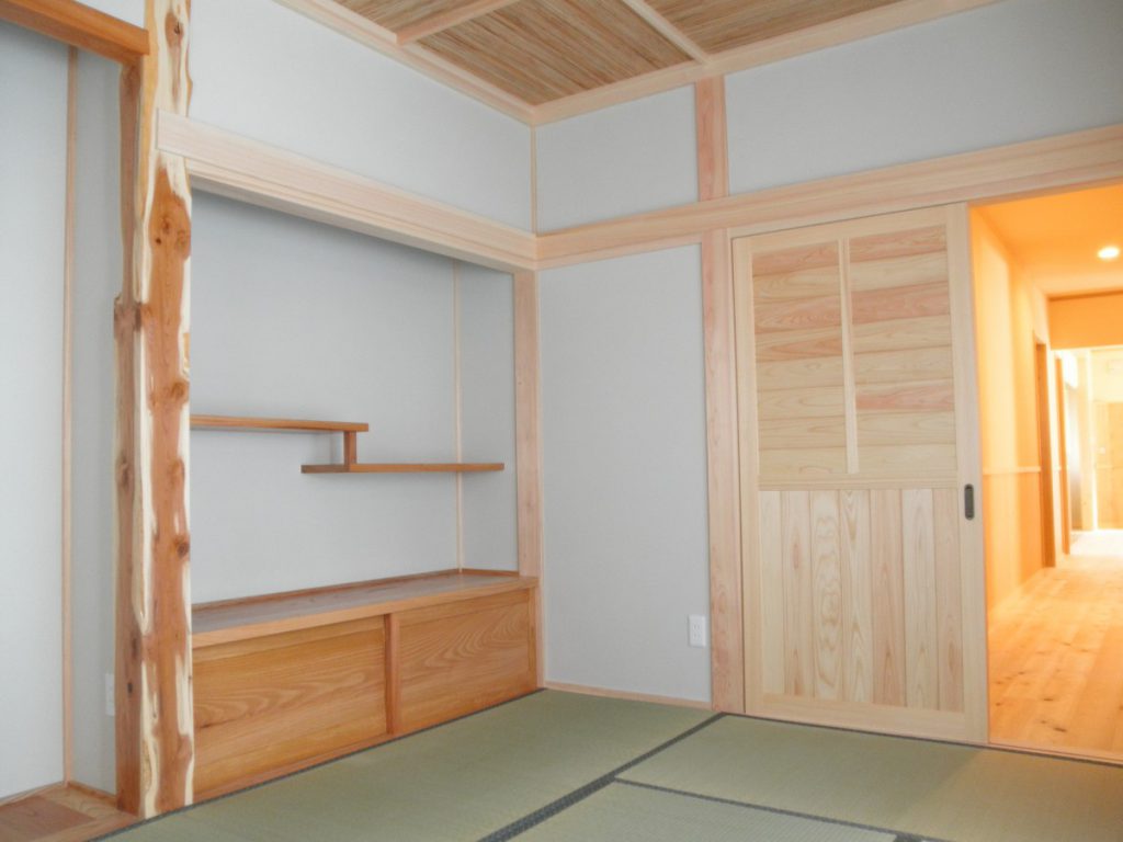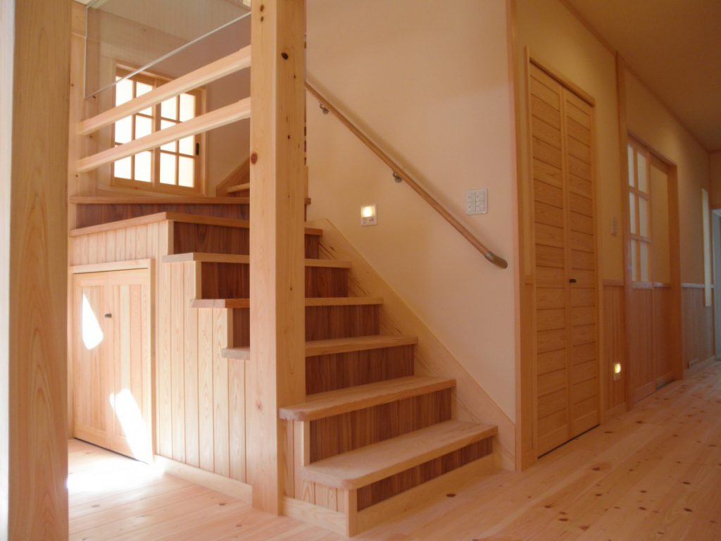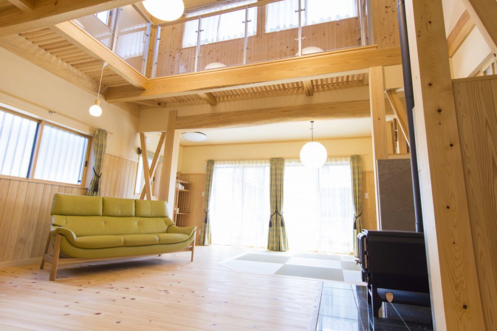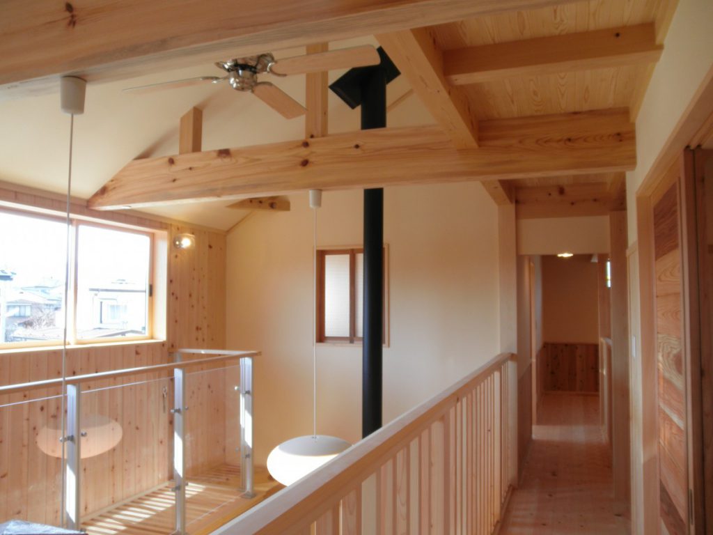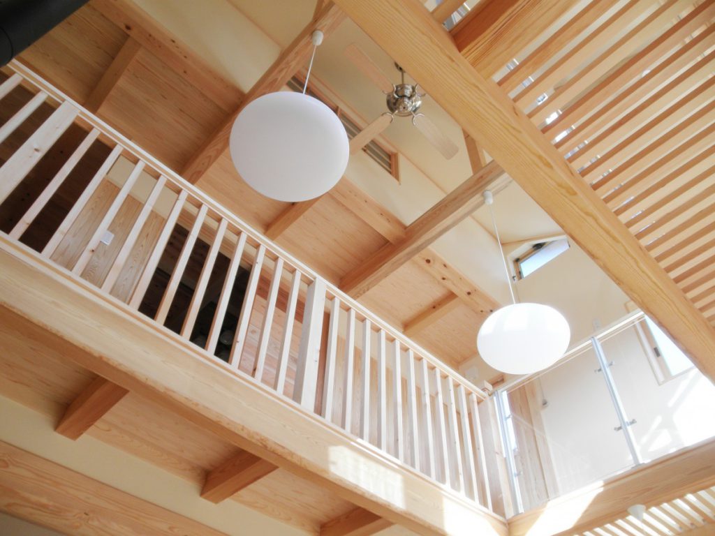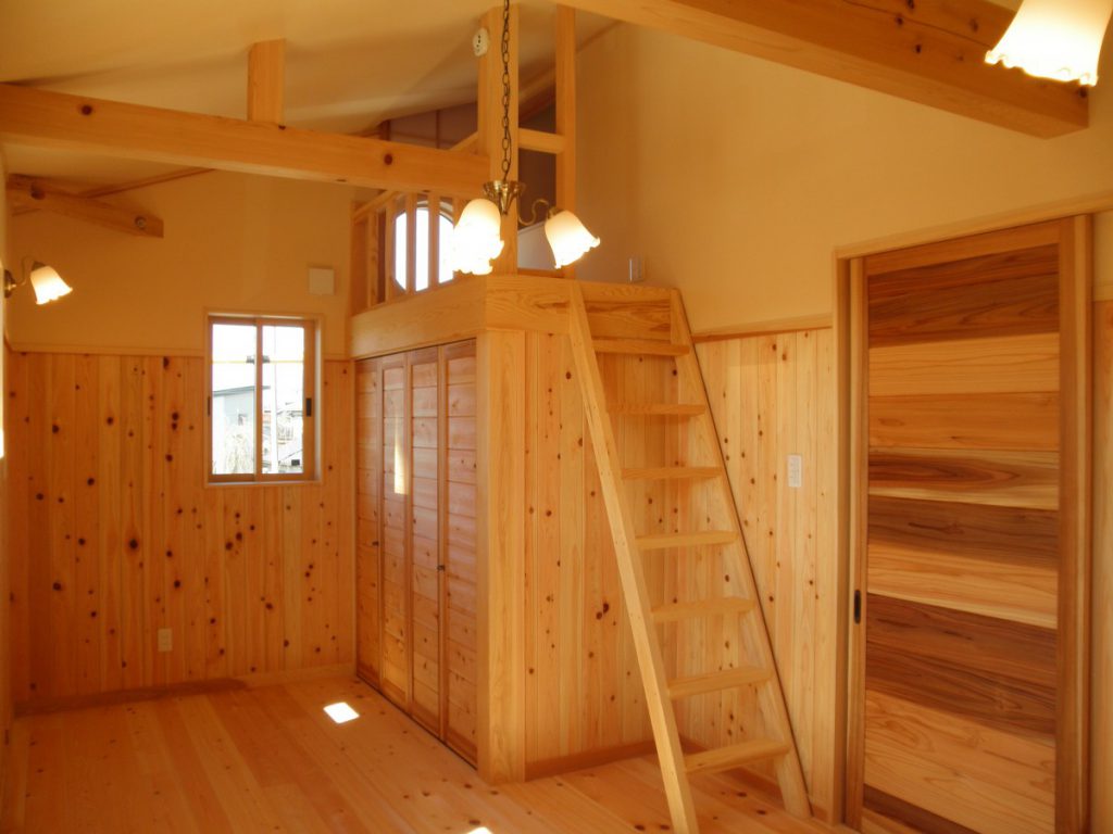 住み手のこだわりの家といえるでしょうか。木にこだわり構造材(柱・梁など)から建具の一枚に至るまで、桧・赤松・杉・欅(けやき)等を使用し適材適所に生かしています。家の中は木の香りでまるで森林の中にいるようだと、お住いのご家族様からお話しいただきました。そして壁と天井、納戸、押入れに至るまですべて珪藻土の塗り壁です。設備関連では、太陽光発電システムと蓄電池の創蓄連携システムを導入しました。また通気断熱WB工法を取り入れることで、自然エネルギーの上手な利用を可能にしています。まさに自給自足の家です。間取りは屋根裏の物置を含め遊び心満載です。子どもが楽しめる空間、また上階の室内窓からリビングにいる家族と会話できる、家族を身近に感じられる空間となりました。
