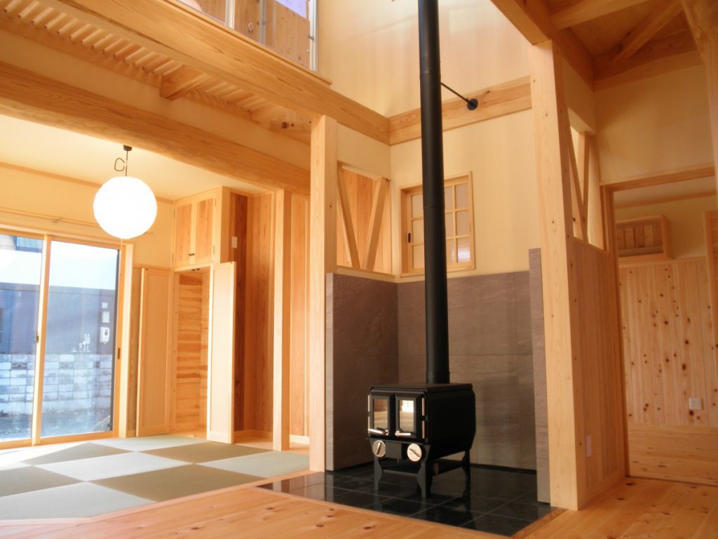 ~最先端技術を活かした木の香る家~ 住み手のこだわりの家といえるでしょうか。木にこだわり構造材(柱・梁など)から建具の一枚に至るまで、桧・赤松・杉・欅(けやき)等を使用し適材適所に生かしています。家の中は木の香りでまるで森林の中にいるようだと、お住いのご家族様からお話しいただきました。そして壁と天井、納戸、押入れに至るまですべて珪藻土の塗り壁です。設備関連では、太陽光発電システムと蓄電池の創蓄連携システムを導入しました。また通気断熱WB工法を取り入れることで、自然エネルギーの上手な利用を可能にしています。まさに自給自足の家です。間取りは屋根裏の物置を含め遊び心満載です。子どもが楽しめる空間、また上階の室内窓からリビングにいる家族と会話できる、家族を身近に感じられる空間となりました。